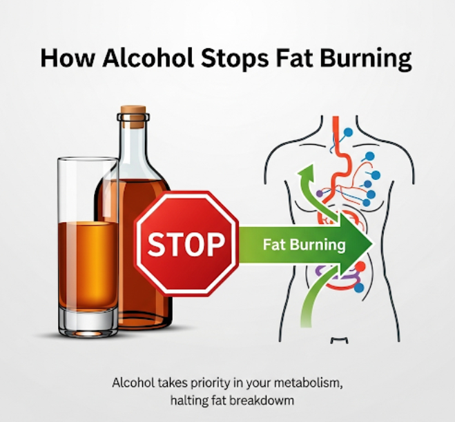 알코올 분해가 최우선으로 진행되어 지방 연소가 완전히 멈춥니다.