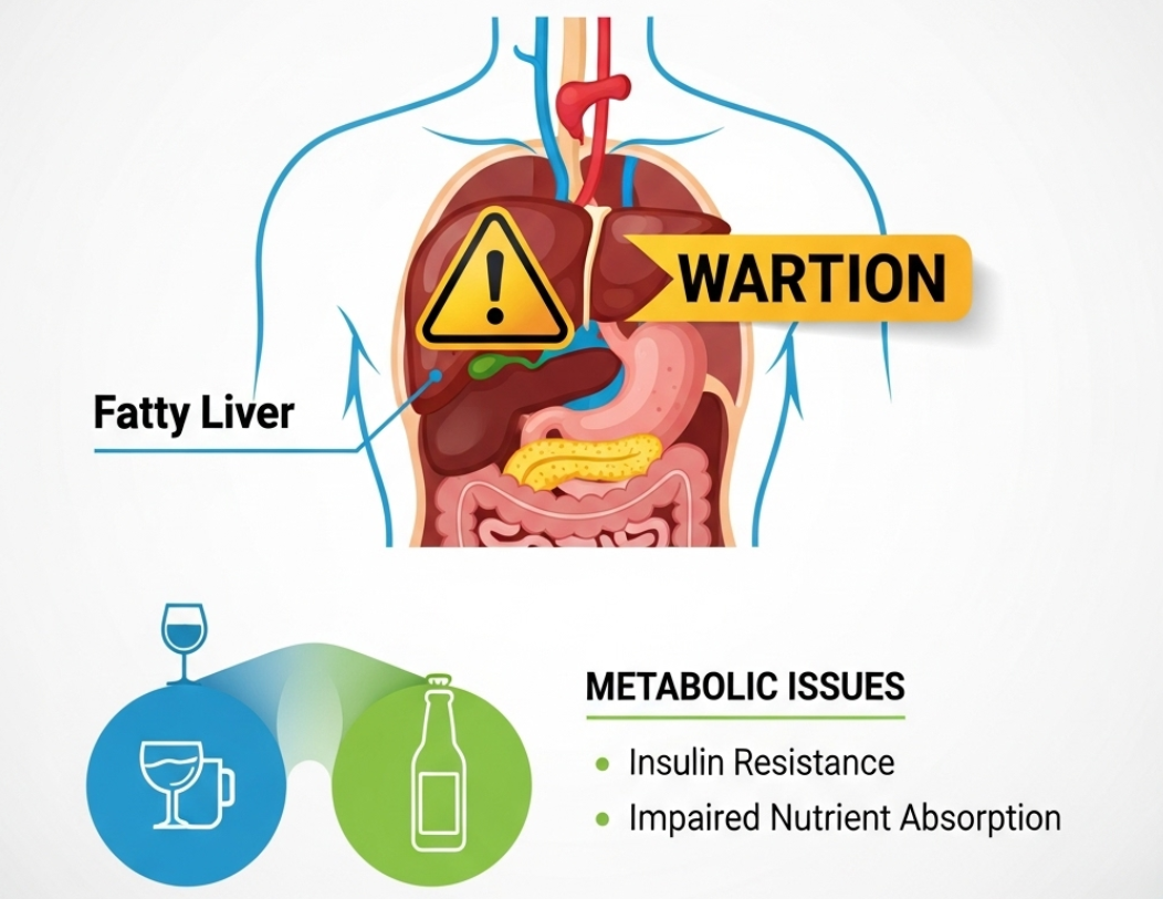 알코올은 지방대사를 방해하여 지방간이나 이상지혈증을 유발하기도 하며, 탄수화물 대사를 방해하여 젖산산증이나 저혈당을 유발하기도 합니다.
