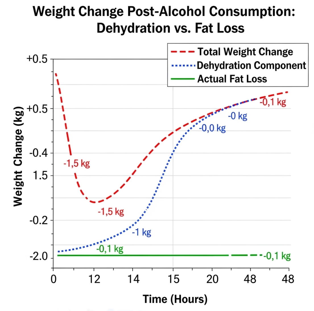 과음한 다음날 체중이 줄어든 것은 대부분 탈수분에 의한 것입니다. 알코올은 근육에 있는 수분과 탄수화물을 심각할 정도로 소모시켜 일시적으로 체중이 감소한 것처럼 보이게 만듭니다.