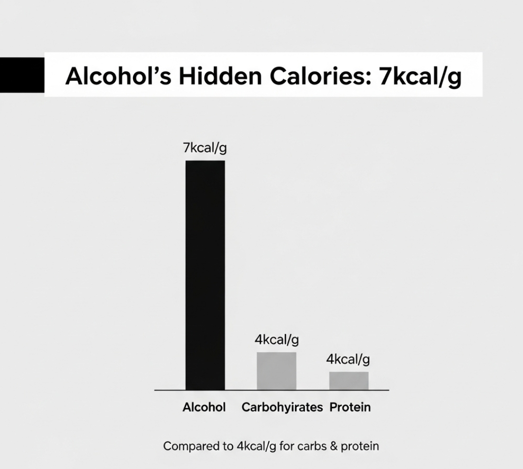알코올은 g당 7kcal로 탄수화물(4kcal)이나 단백질(4kcal)보다 높은 열량을 가지고 있습니다.