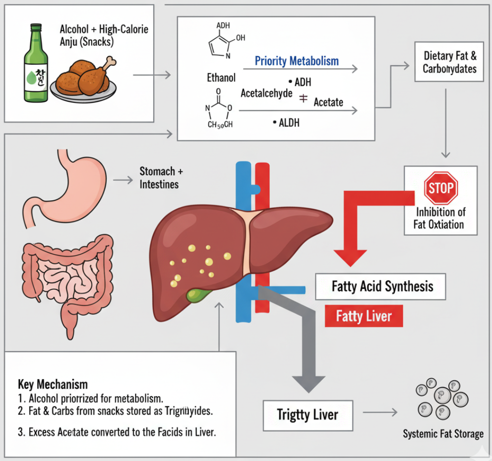 이것은 과장이 아닌 의학적 사실입니다. 알코올 분해에 모든 에너지가 집중되는 동안, 안주로 섭취한 칼로리는 에너지로 쓰이지 못하고 고스란히 지방으로 축적됩니다.